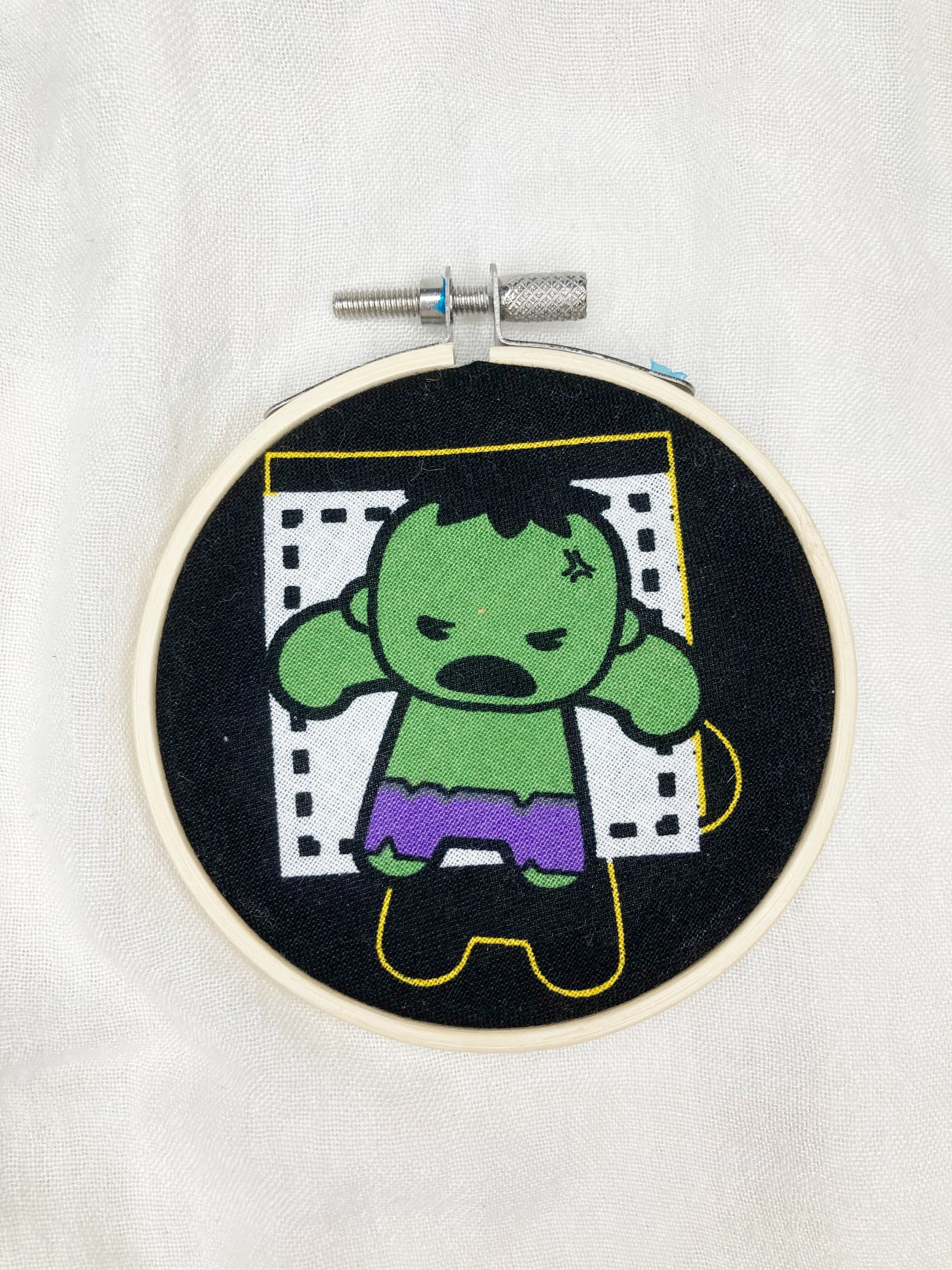 3” hoop with fabric. Image placement varies. Colors may differ in person due to device settings.