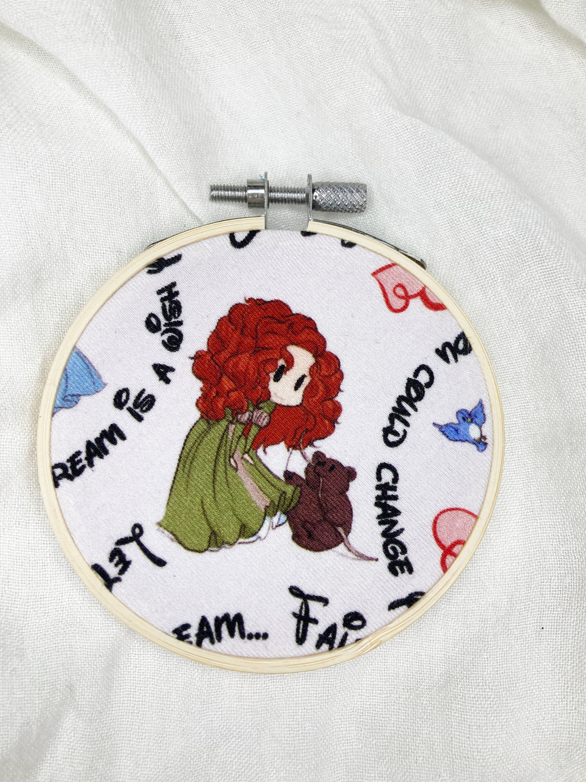 3” hoop with fabric. Image placement varies. Colors may differ in person due to device settings.