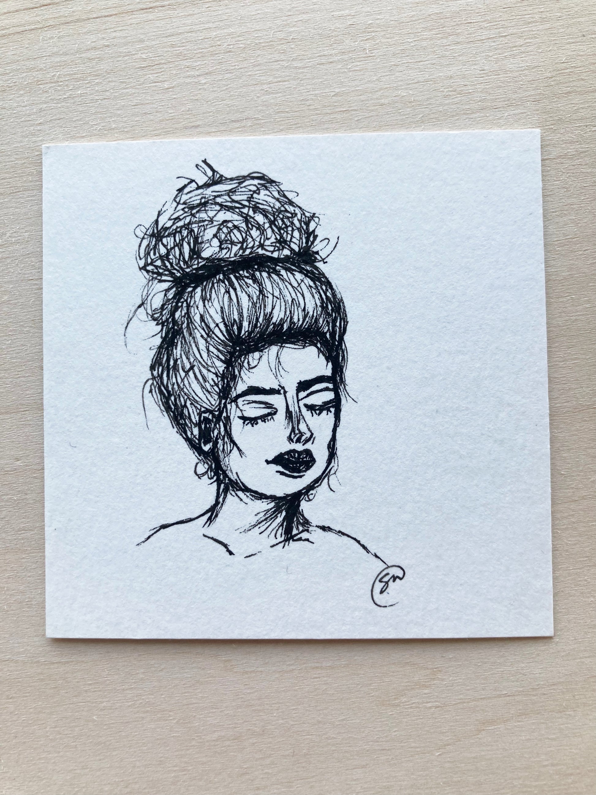 Original one of a kind ink drawing at an affordable price! This mini drawing is 3”x3” on 140 lb watercolor paper. Initialed on front. Signed and dated on the back.