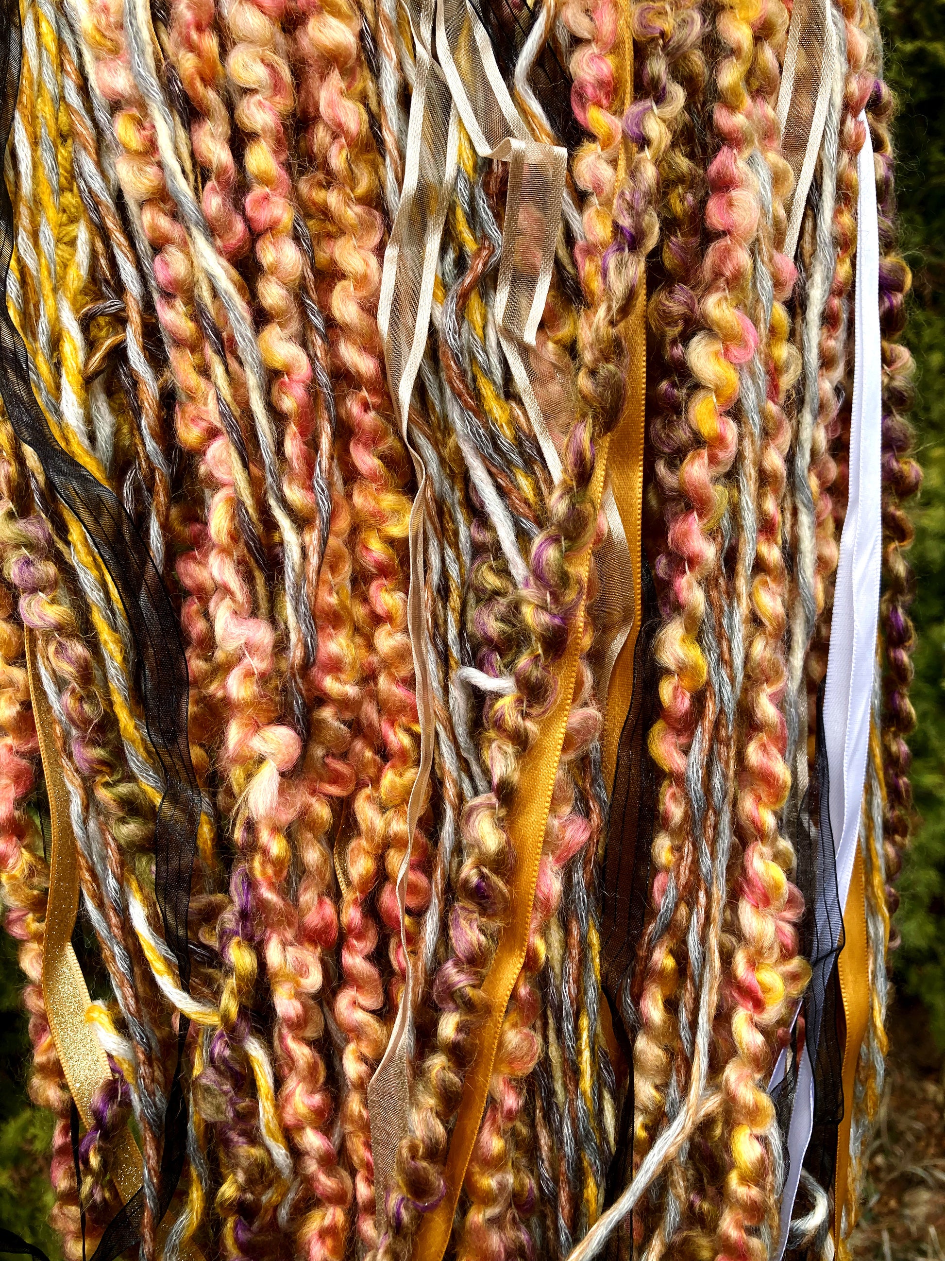 ‘Made with a variety of yarns and ribbon.