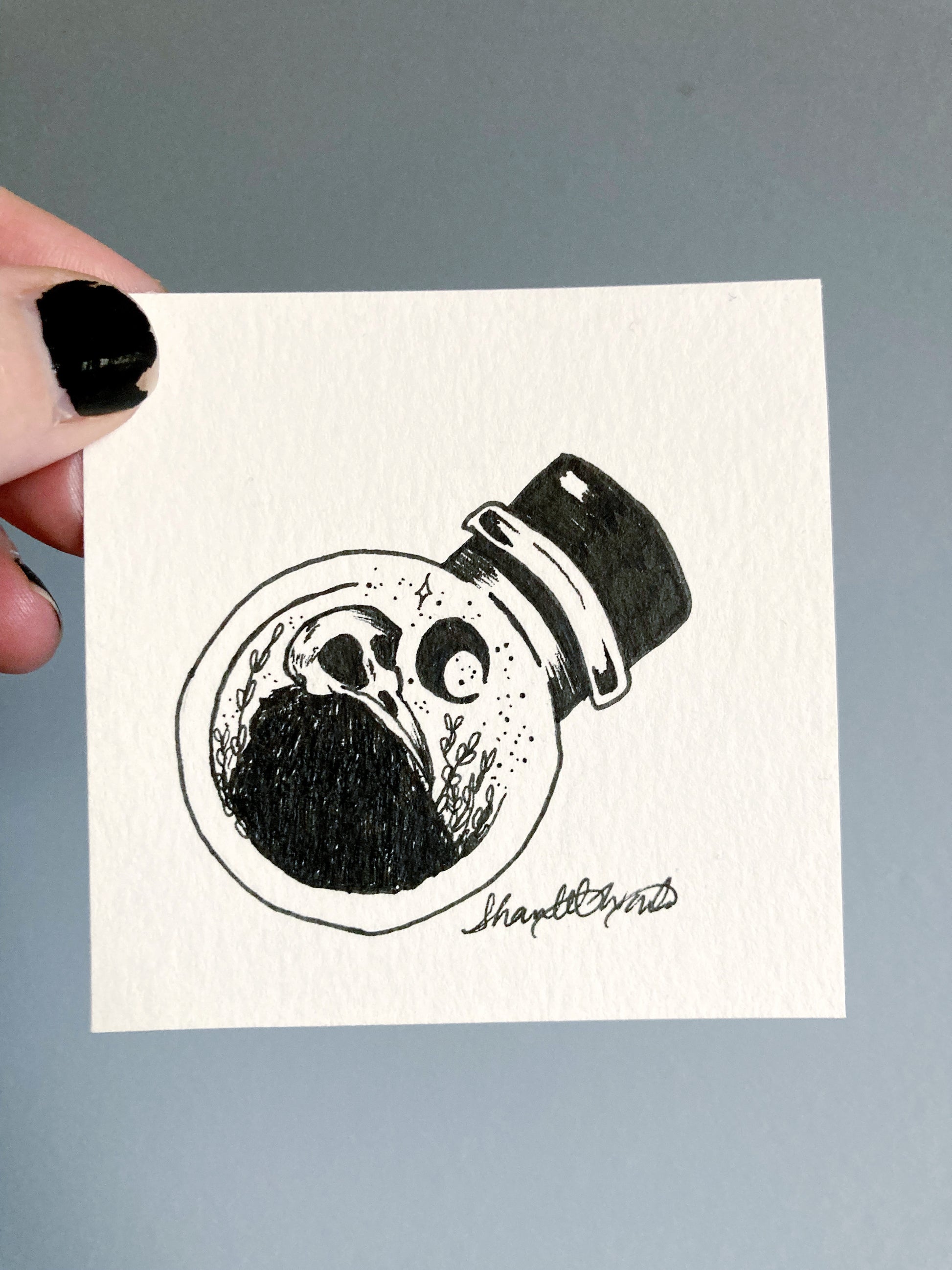 Original one of a kind ink drawing. This mini drawing is 3”x3” on 140 lb watercolor paper. Signed on the front