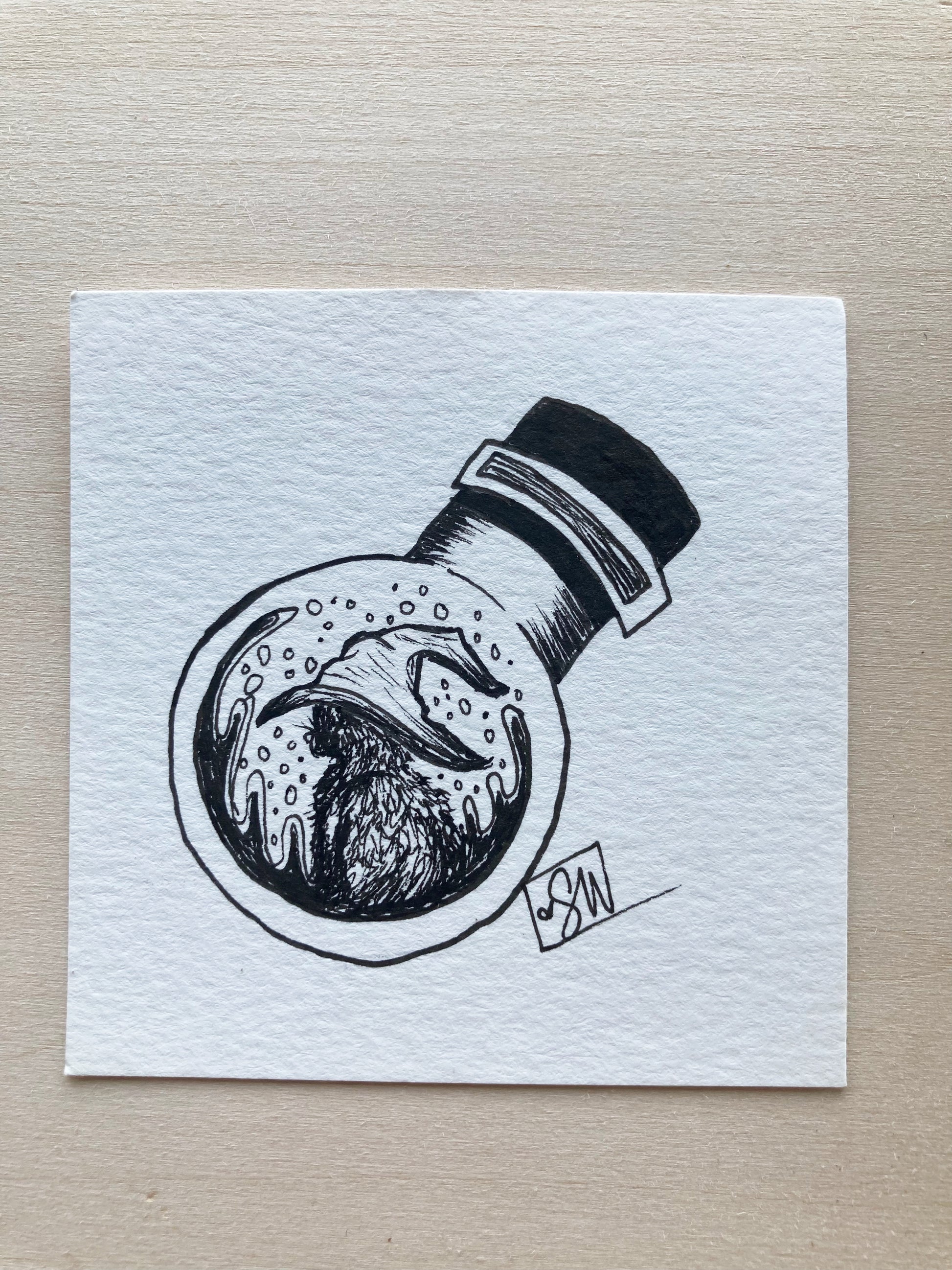 Original one of a kind ink drawing. This mini drawing is 3”x3” on 140 lb watercolor paper. Signed on the front