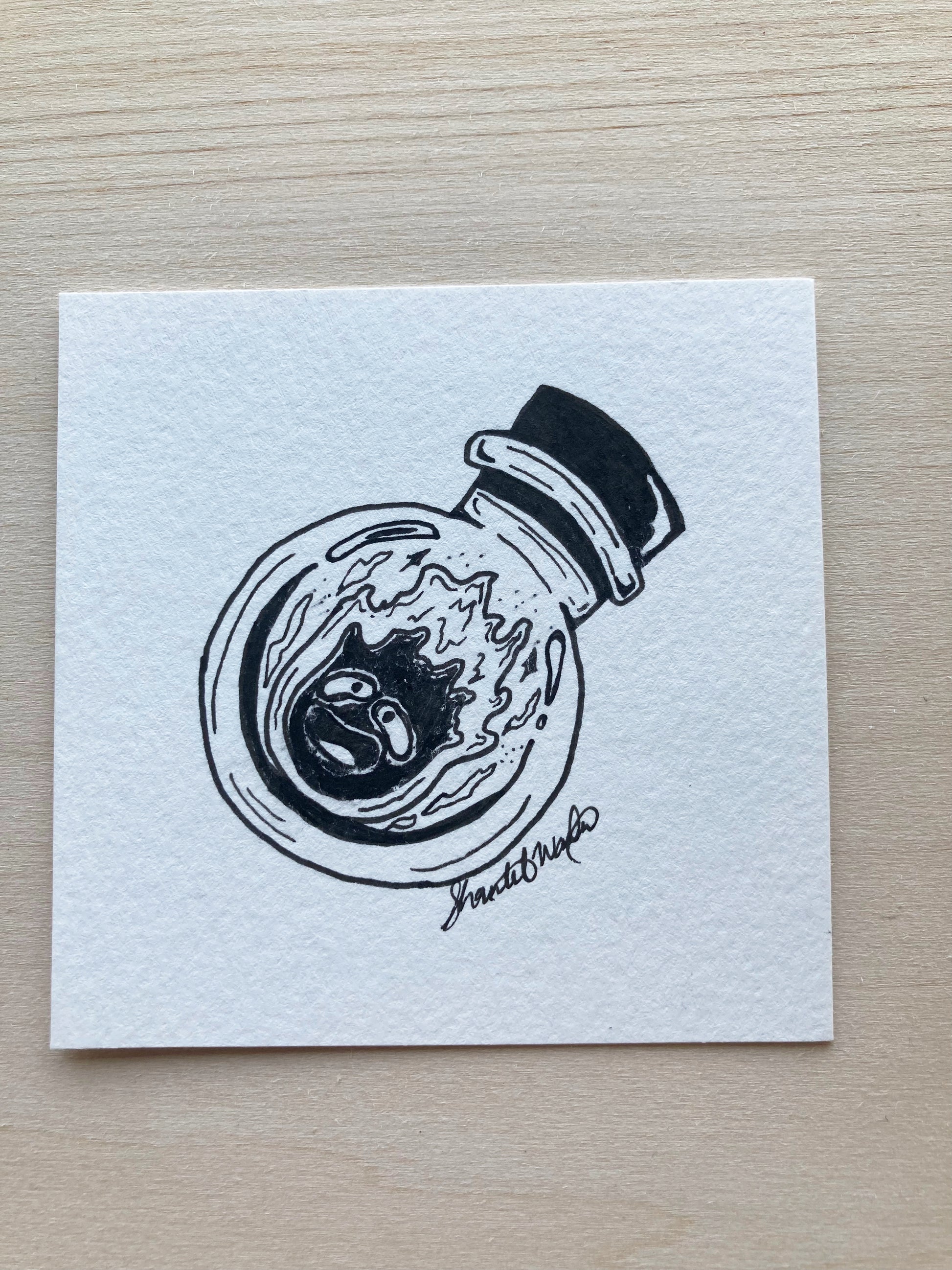 Original one of a kind ink drawing. This mini drawing is 3”x3” on 140 lb watercolor paper. Signed on the front