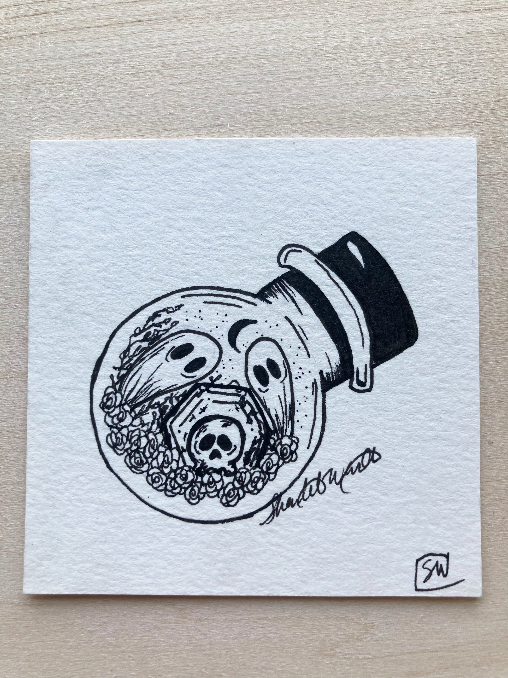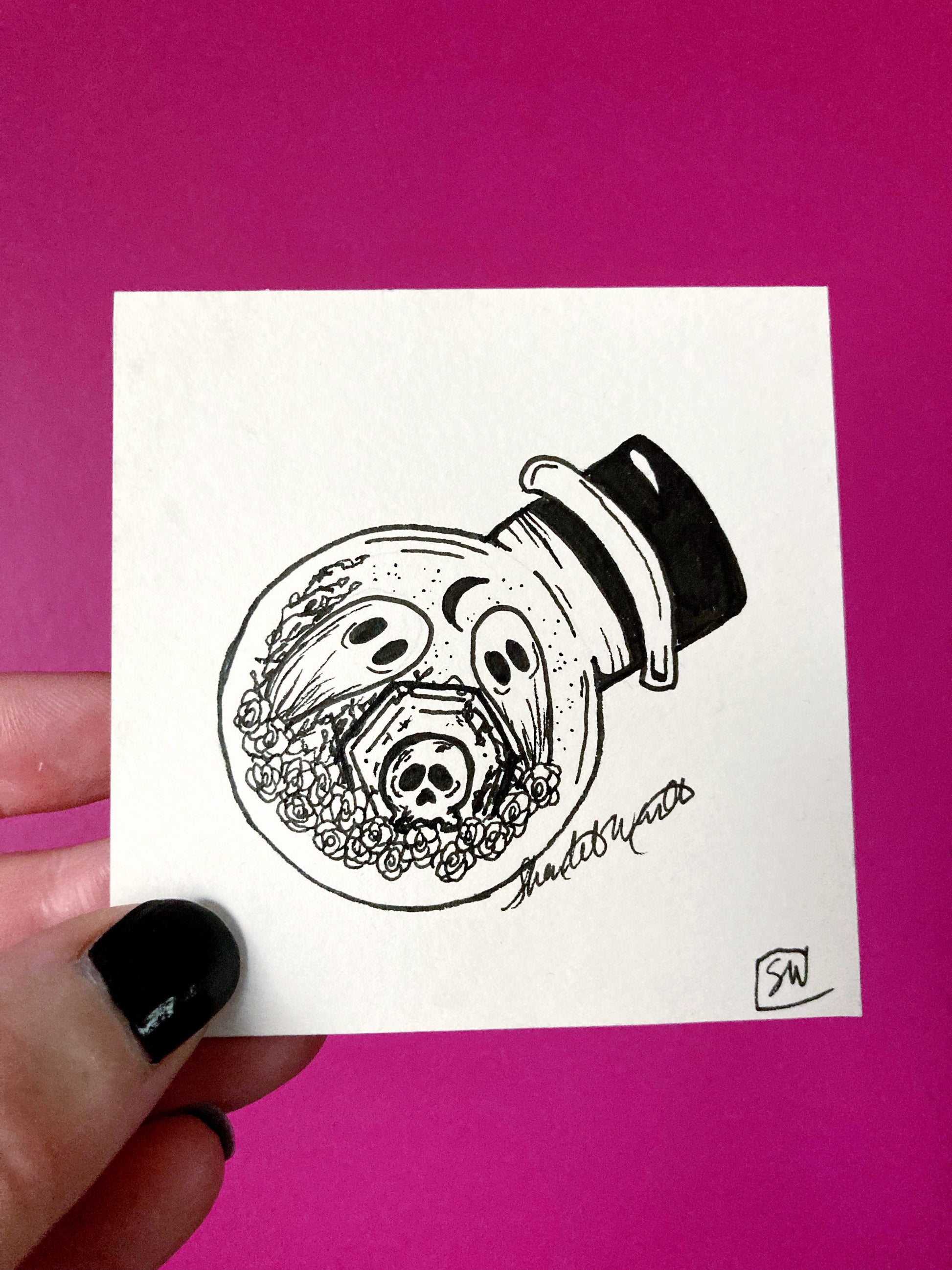 Original one of a kind ink drawing. This mini drawing is 3”x3” on 140 lb watercolor paper. Signed on the front
