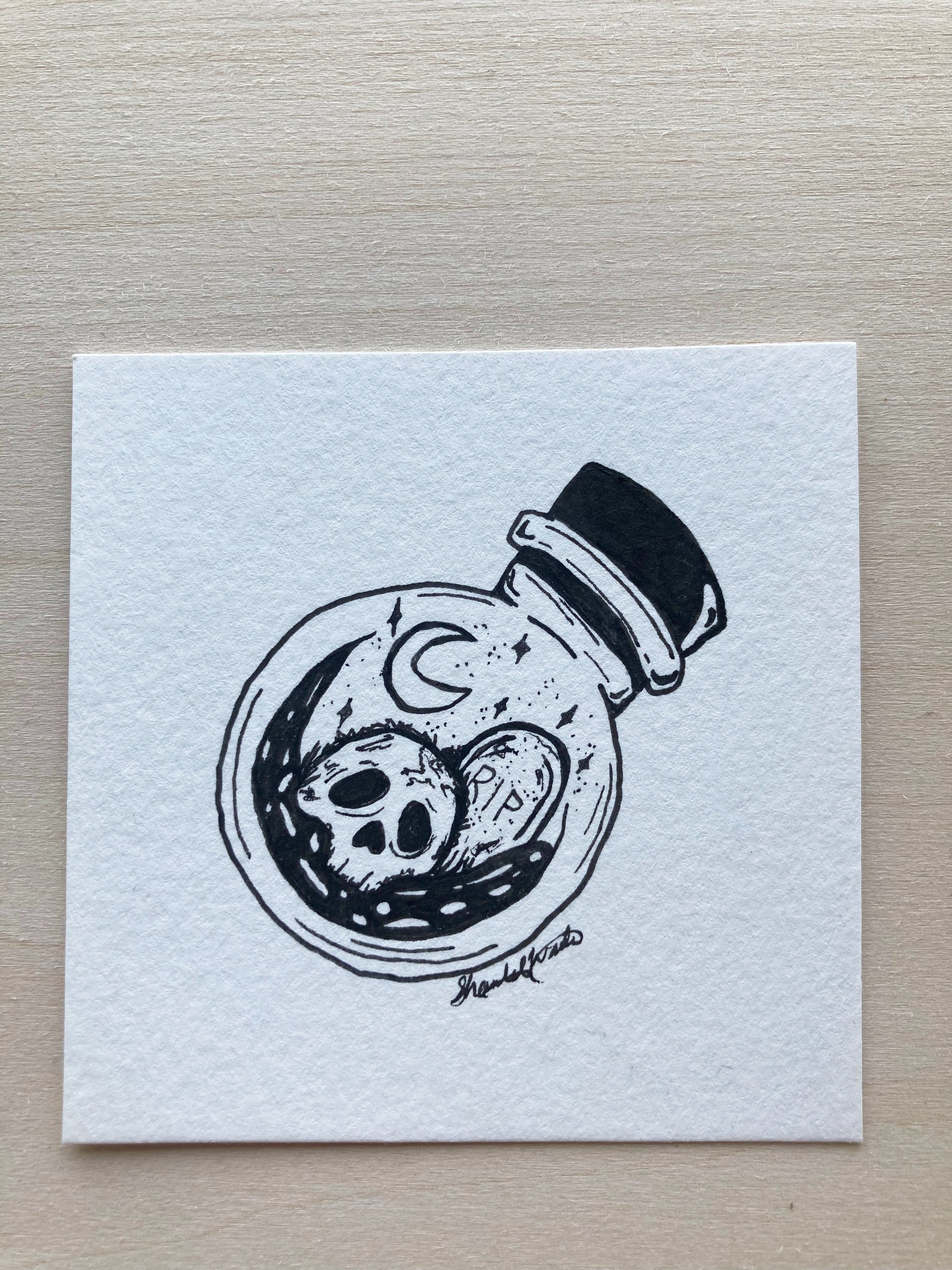 Original one of a kind ink drawing. This mini drawing is 3”x3” on 140 lb watercolor paper. Signed on the front