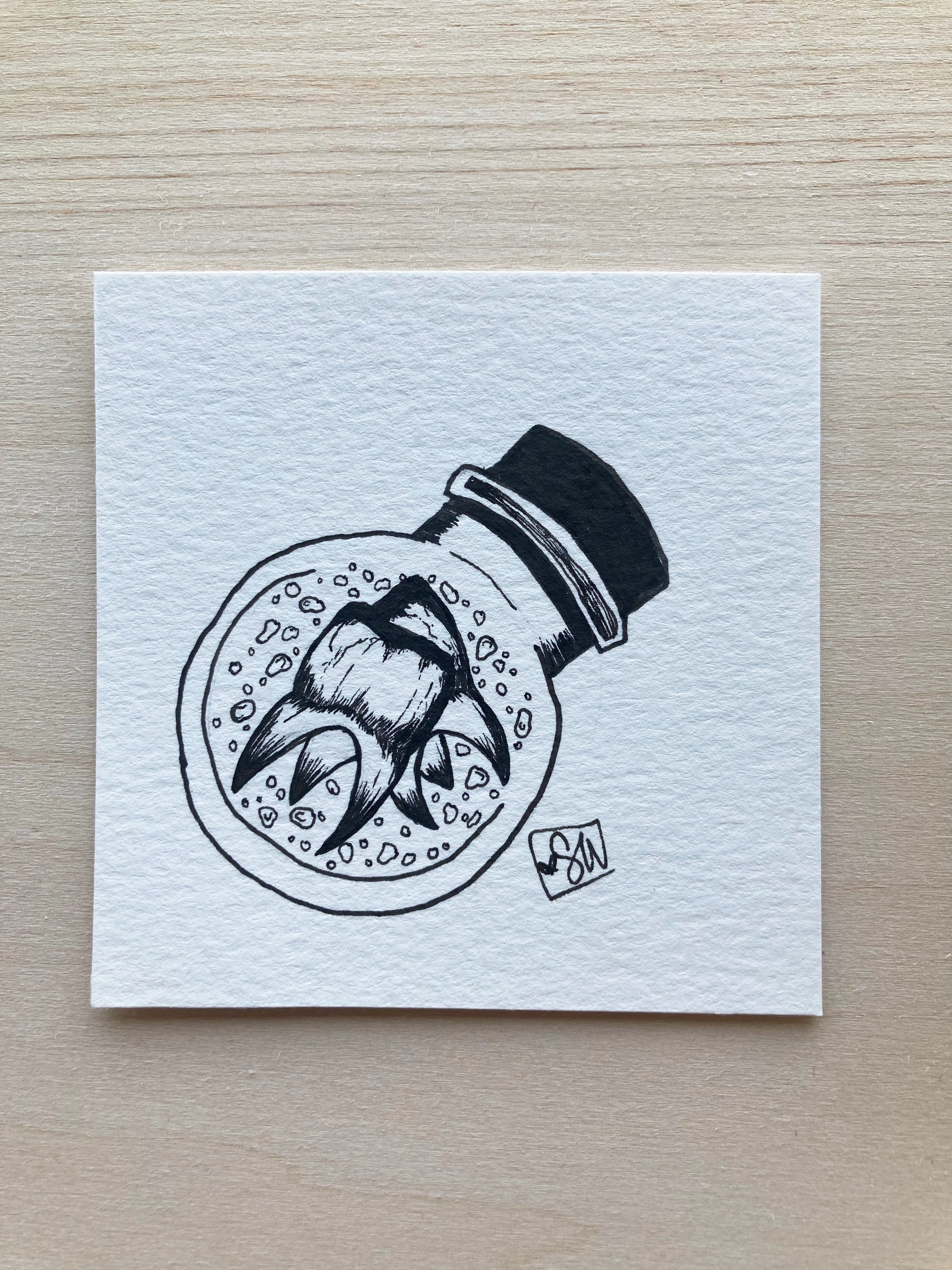 Original one of a kind ink drawing. This mini drawing is 3”x3” on 140 lb watercolor paper. Signed on the front