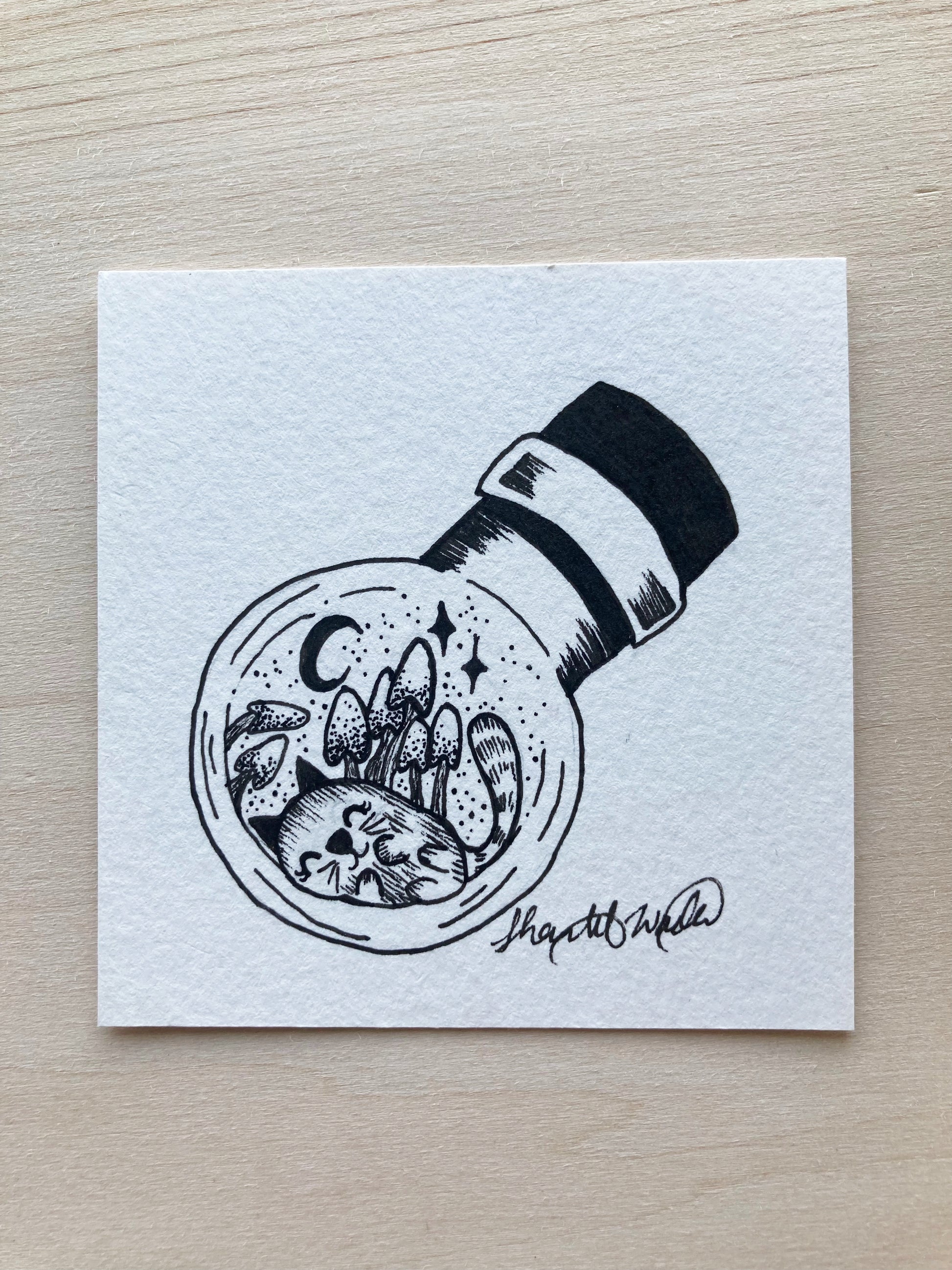 Original one of a kind ink drawing. This mini drawing is 3”x3” on 140 lb watercolor paper. Signed on the front
