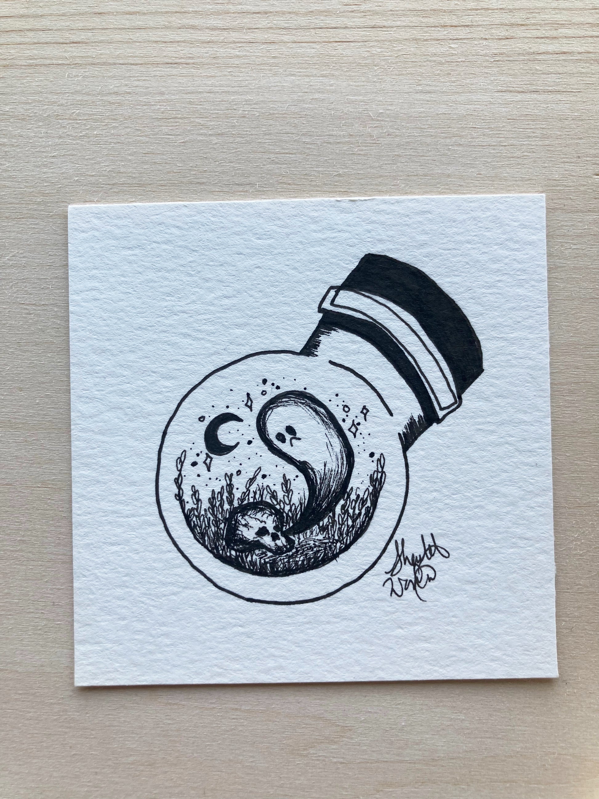 Original one of a kind ink drawing. This mini drawing is 3”x3” on 140 lb watercolor paper. Signed on the front