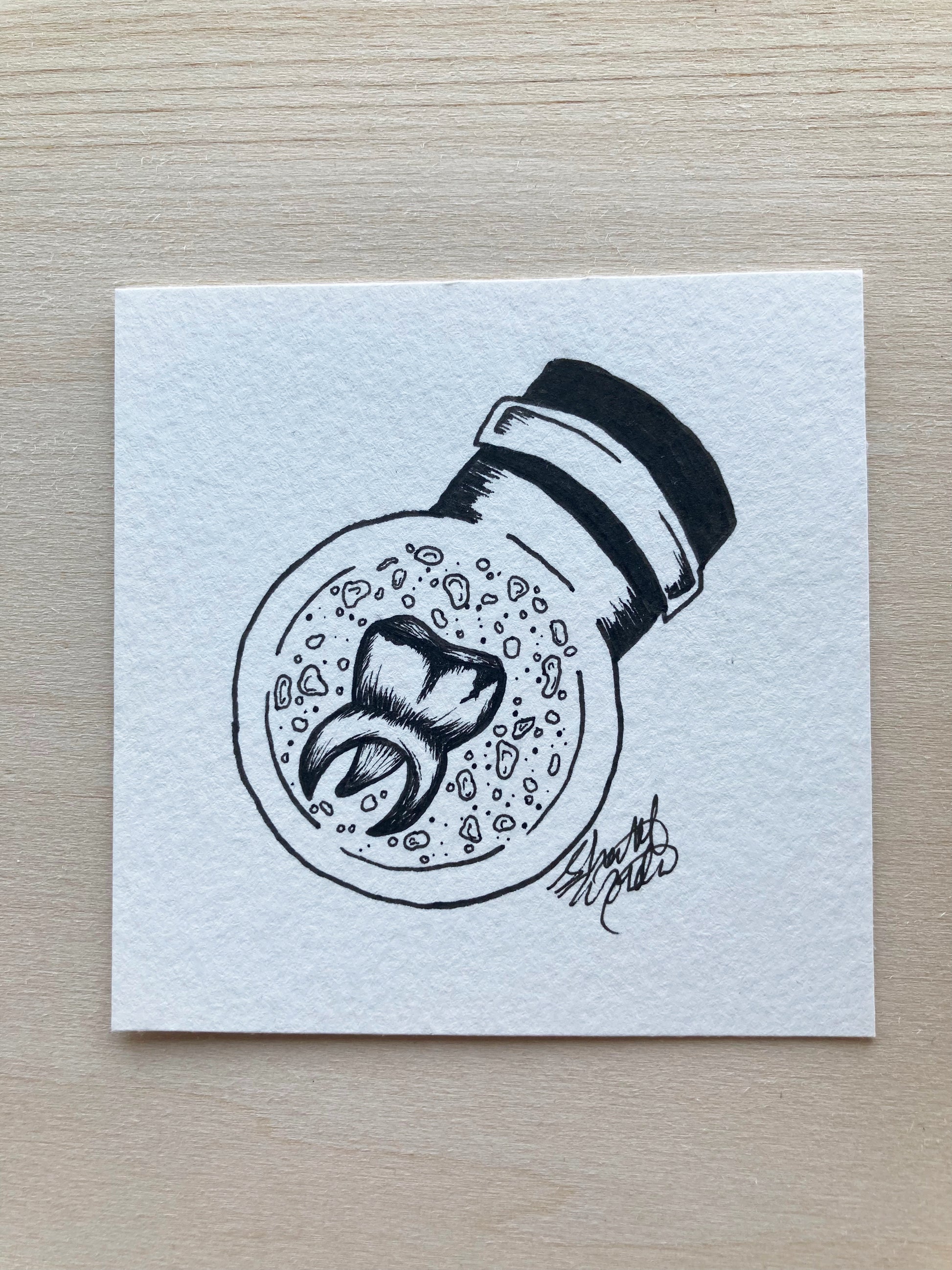 Original one of a kind ink drawing. This mini drawing is 3”x3” on 140 lb watercolor paper. Signed on the front