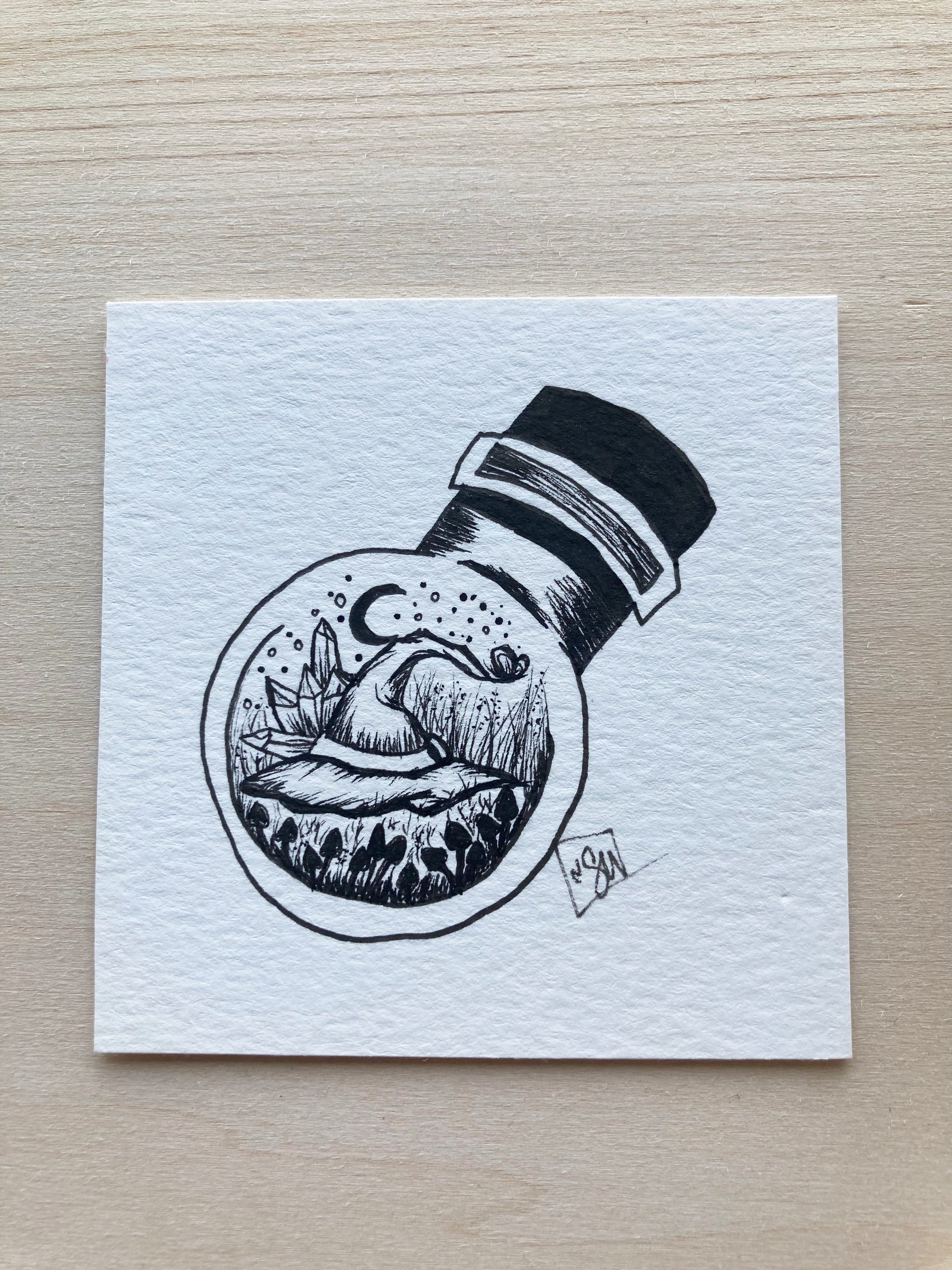Original one of a kind ink drawing. This mini drawing is 3”x3” on 140 lb watercolor paper. Signed on the front
