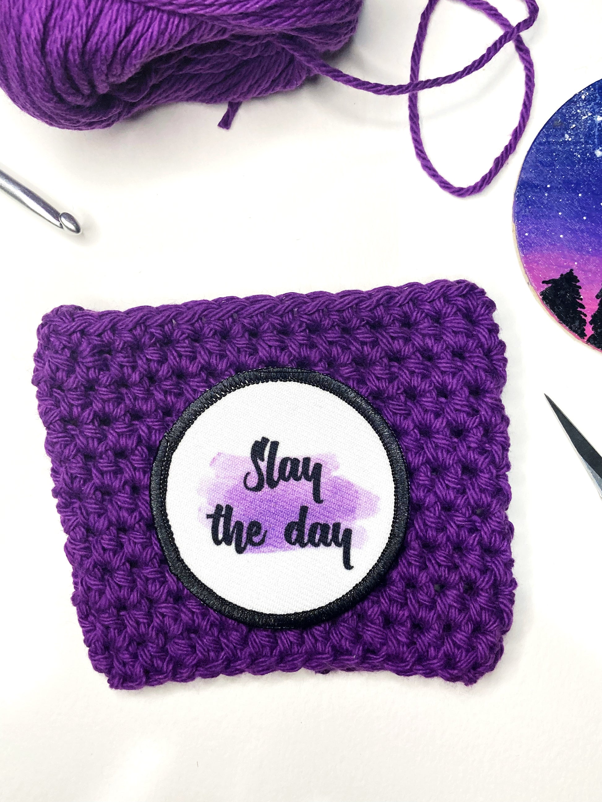 Slay the Day reusable crochet coffee cozy